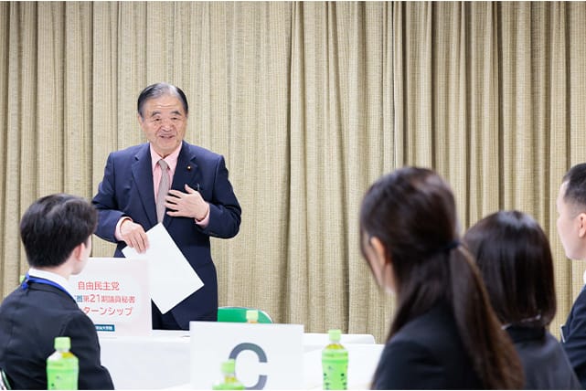 党中央政治大学院は10月30日、党本部にて「首都圏第21期インターンシップ」の実習生を対象とした集合研修を開催。冒頭の挨拶で遠藤利明中央政治大学院長は、小学5年生の時に政治家を志した背景や政治家として最も悩んだ法案への対応などを紹介しつつ、実習生に対して本インターンシップの事務所実習や会合への積極的な参加を通じて政治家の政治への真剣な想いなどを感じ取り、今回の経験を人生の糧として欲しいとエールを送りました。