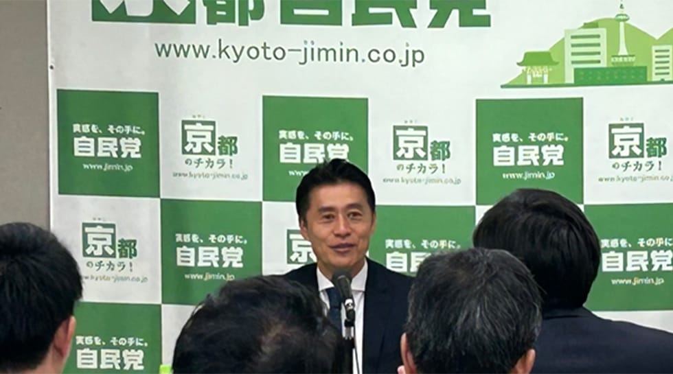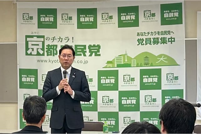 冒頭、京都府連を代表して勝目康京都府連会長と、きょうと青年政治大学校を運営している府連青年局を代表して府連青年局長の平山たかお京都市議会議員がそれぞれ挨拶に立ちました。