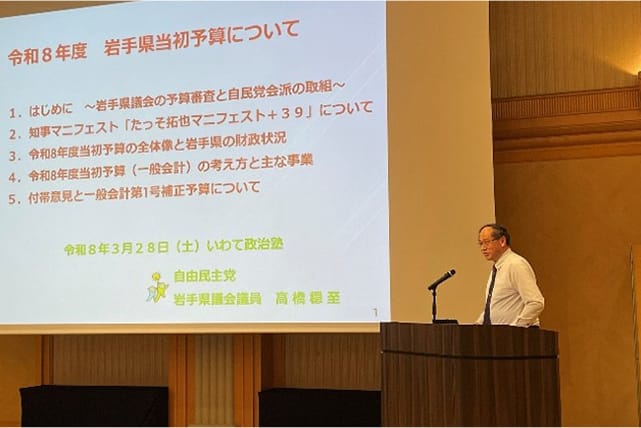 第5回講座では、党岩手県連政務調査会長の高橋穏至県議会議員が「令和8年度岩手県の当初予算について」と題し、岩手県議会の予算審査のしくみや事業の概要に加え、現職知事のマニフェストの検証などについて説明しました。