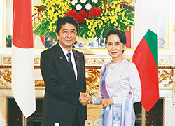 Prime Minister and LDP President Shinzo Abe met with State Counselor Aung San Suu Kyi of Myanmar, a Japanophile who once studied at Kyoto University. He praised her "undaunting efforts as a leader in the democracy movement," expressed his desire to work together as trusted partners, and announced a package of 800 billion yen in public and private-sector support over the next five years for programs in agriculture, human resource development, and infrastructure.