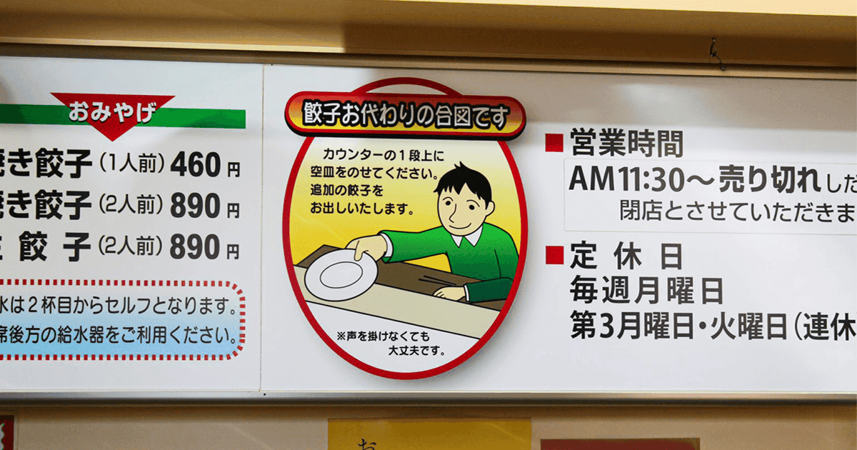 席(カウンター席のみ)につくと、餃子1人前(8個)がでてきます。食べ終わったお皿をカウンターの上に置くとおかわりの合図。次の1人前が出てきます。
