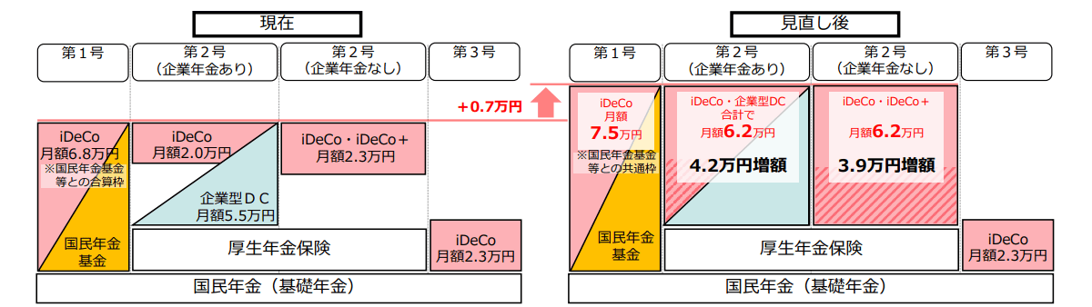 具体的には1号被保険者(国民年金加入の自営業者等)の拠出限度額を国民年金基金との合計額6.8万円を7.5万円に引き上げます。第2号被保険者(厚生年金加入者)の拠出限度額も企業型確定拠出年金(DC)の有無に関わらずそれぞれ増額。賃金が上昇していることや老後の資金確保のニーズが高まっていることを受けた見直しを行います。