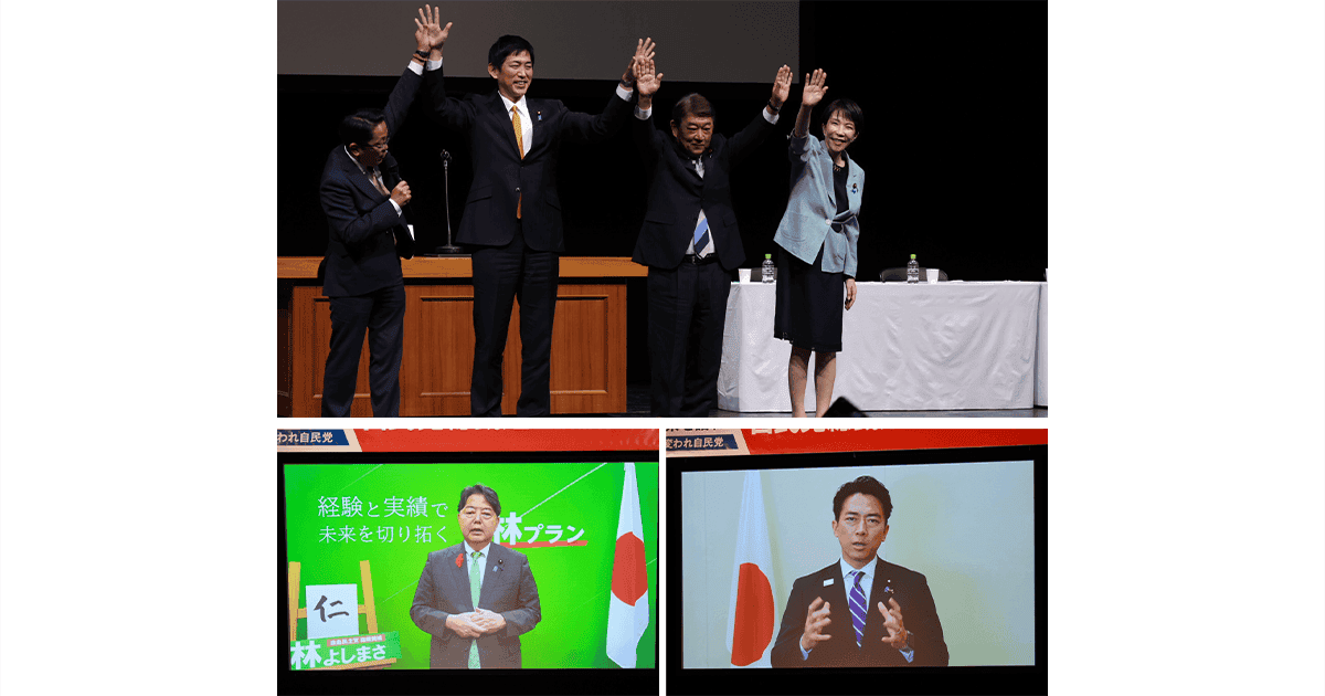 総裁選の投開票日まで残り2日となる10月2日、総裁候補による最後の所見発表演説会が大阪市で開かれ、各候補はわが国経済のさらなる成長に向けて取り組む政策を訴えました。演説会には小林鷹之、茂木敏充、高市早苗の各候補が参加し、現職閣僚の林芳正、小泉進次郎両候補は公務のためビデオメッセージを寄せました。