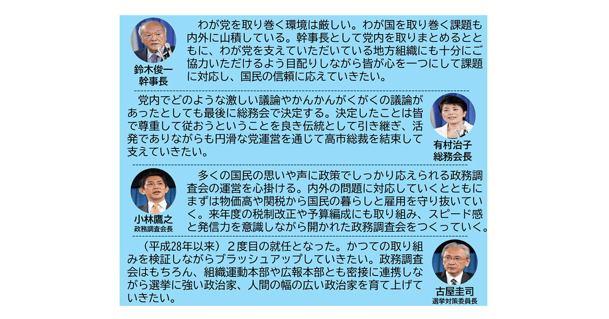 高市早苗新総裁の選出に伴い、10月7日に総務会が開かれ、新たな党役員人事が決定しました。わが党は高市総裁の下、一致結束し国民が抱える未来への不安を希望と夢に変えるための政策作りをはじめとする党運営を進めていきます。