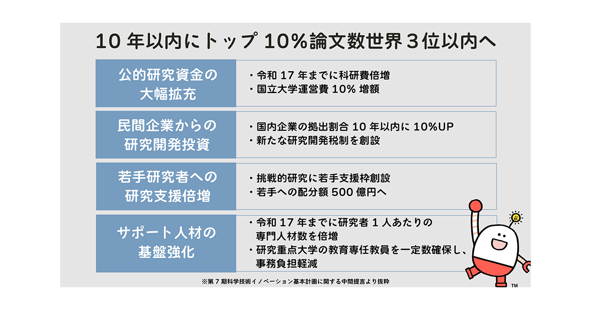 わが党は8月に党科学技術・イノベーション戦略調査会が取りまとめた提言で、「10年以内に世界上位10パーセント論文数で世界3位以内を国家目標に設定すべき」として、基礎研究力の回復を掲げました。