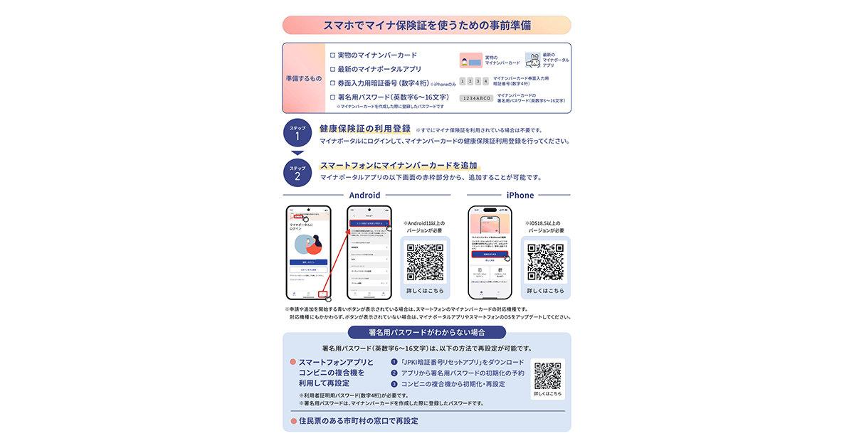 スマートフォンのマイナ保険証利用では、「iphoneのマイナンバーカード」とアンドロイド端末のスマホ用電子証明書機能を活用します。同機能を利用するための事前準備では、実物のマイナンバーカードや最新のマイナポータルアプリ、券面入力用暗証番号(数字4桁、iphoneのみ)、署名用パスワード(英数字6~16文字)が必要になります。