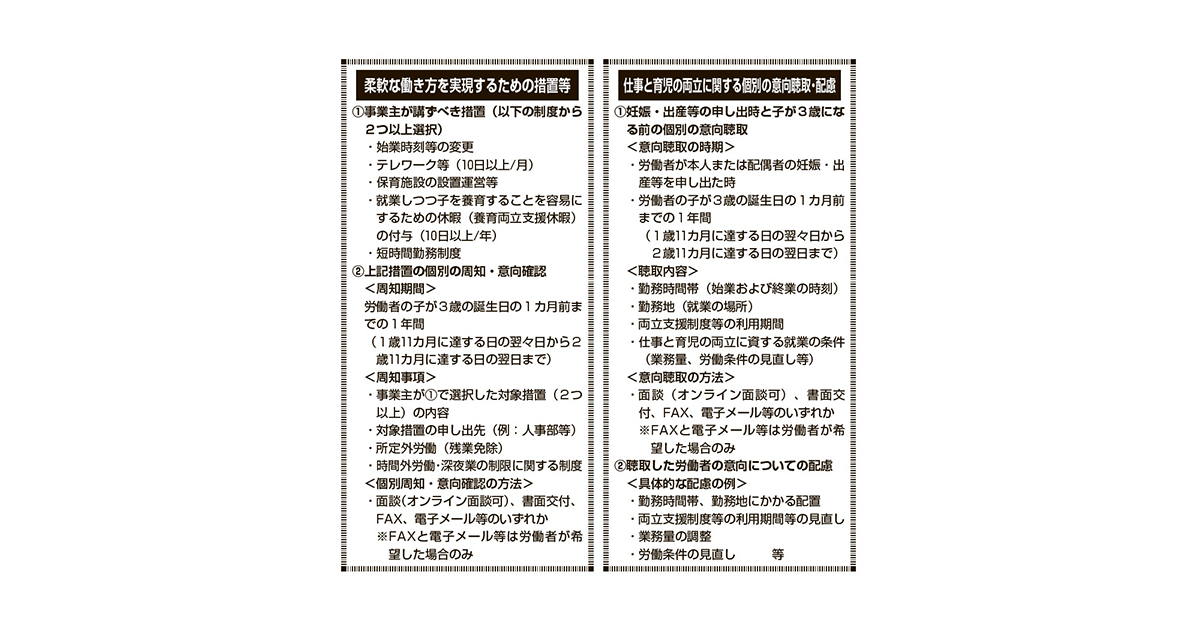 男女共に仕事と育児・介護が両立できるように、育児・介護休業法が改正され、4月から段階的に施行。10月からは「柔軟な働き方を実現するための措置等」と「仕事と育児の両立に関する個別の意向聴取・配慮」が新たに施行されました。ポイントをまとめました。