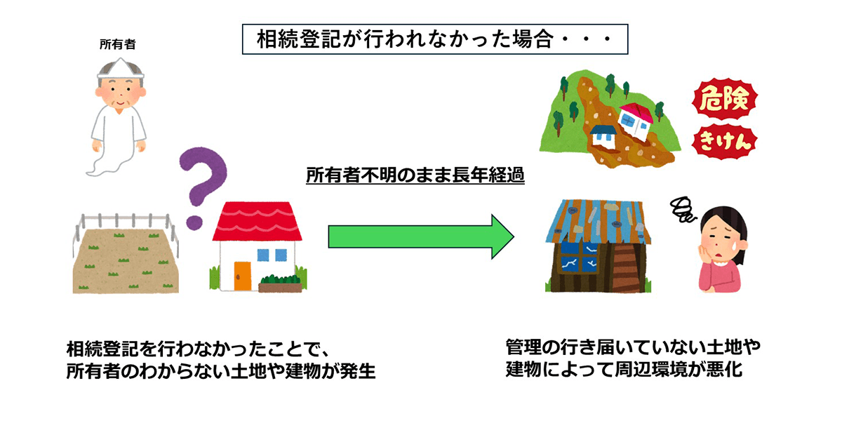 近年、同手続きが行われないまま長年が経過し、所有者を特定することができない「所有者不明土地」が全国で増加しています。所有者がわからないことで、土地の適正な管理が行われず周辺環境が悪化したり、土地開発の妨げになったりする等さまざまな問題が深刻化しています。