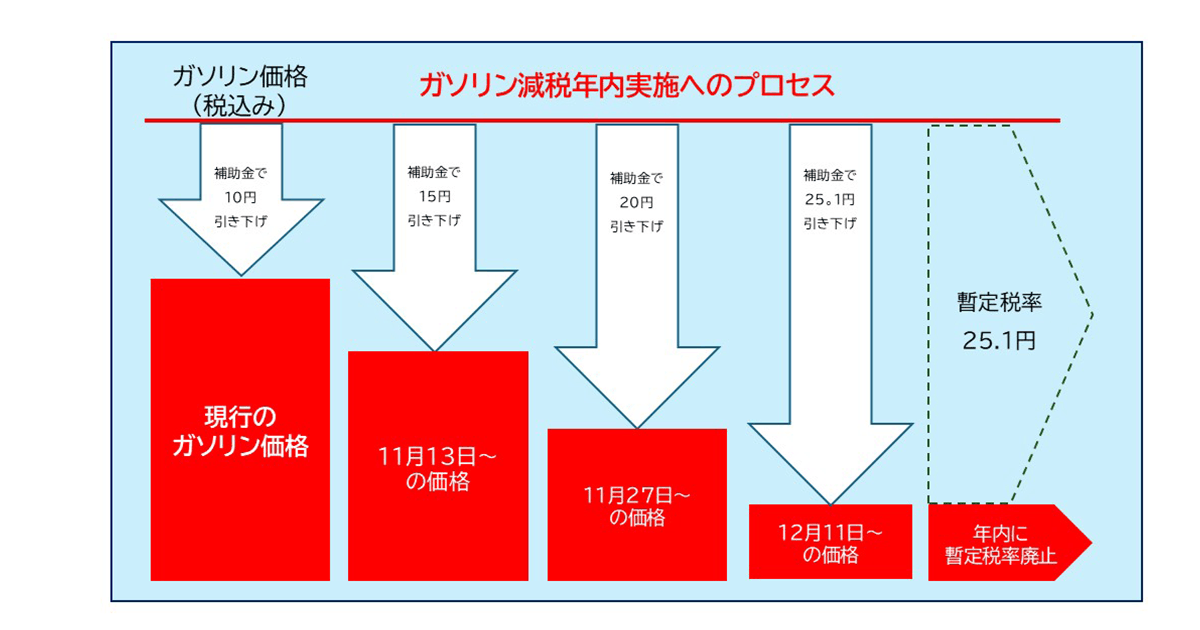 ガソリン価格が急激に下がることによるガソリンスタンドや元売り業者への影響を避けるため、現在1リットル当たり10円程度補助されている補助金を11月13日から段階的に増やし、暫定税率分に相当する25.1円まで補助金を増やした後、年内に暫定税率を廃止します。廃止には法改正が必要で、与野党6党の実務者は臨時国会中で、野党提出の法案について修正を行って法改正を実現することを確認しました。