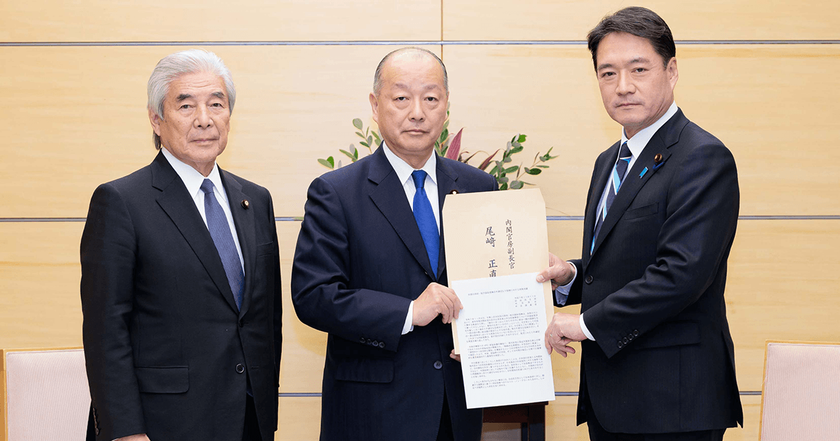 尾﨑正直内閣官房副長官に決議を手渡す高木啓党外交部会長と中曽根弘文党外交調査会長