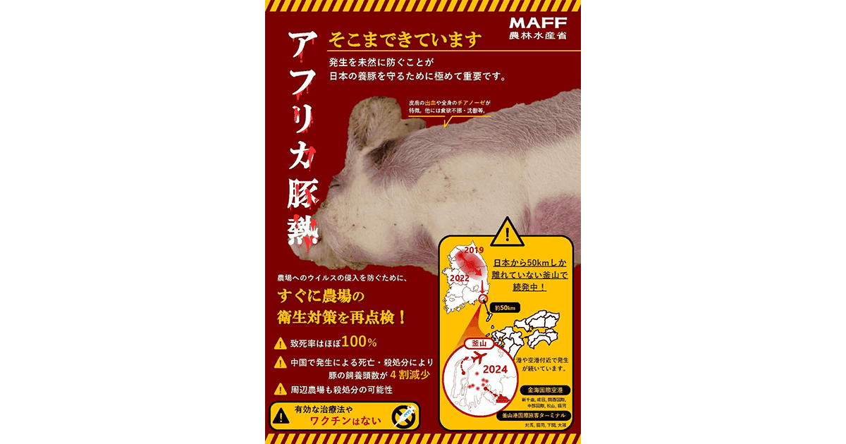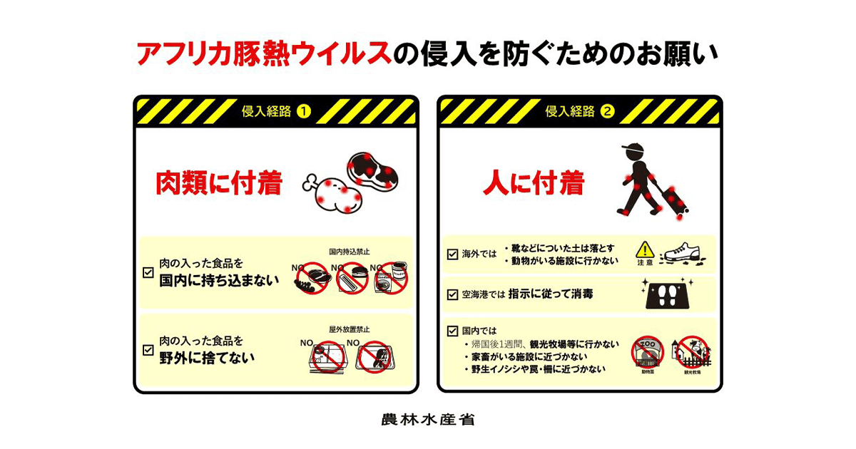 世界中で猛威を振るっているアフリカ豚熱(ASF)がわが国にも迫っています。ASFが発生すると、養豚産業に甚大な損害を与えるだけでなく、豚肉の価格が高騰する等、消費者にとっても大きな影響を及ぼす可能性があります。ASF等の家畜伝染病を水際で防ぐため、一人一人ができる対策を行うことが重要です。