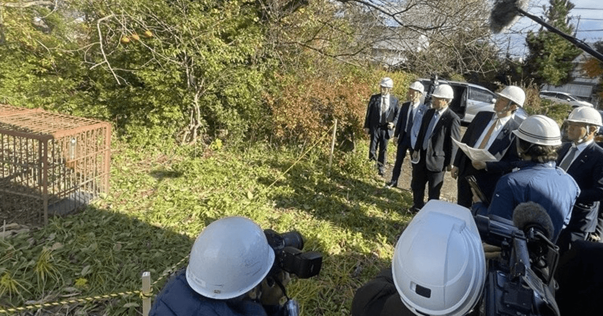 秋田県北秋田市で住宅街に設置された箱わなを視察する小林鷹之政務調査会長(右2人目)