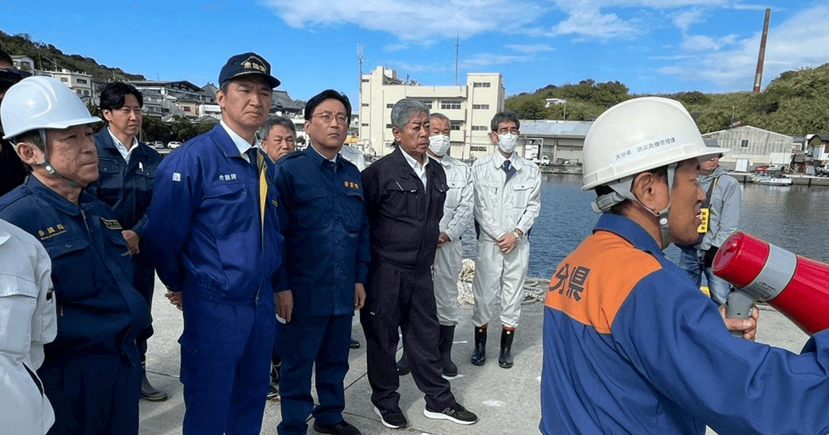 大分市の佐賀関漁港を視察する古賀篤党災害対策特別委員長(左3人目)