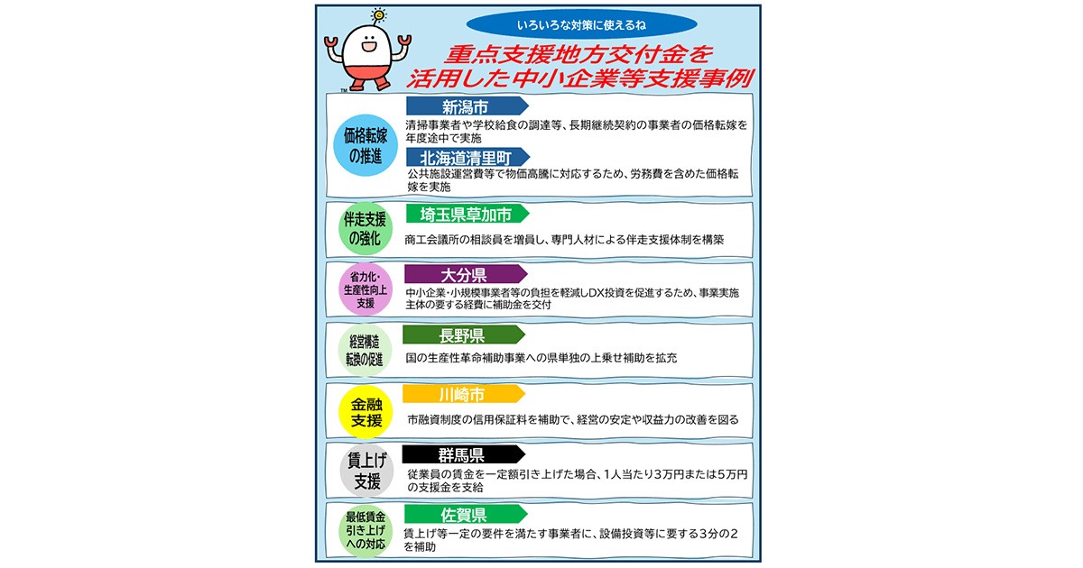 令和7年度補正予算に盛り込まれている重点支援地方交付金の拡充には、中小企業・小規模事業者の賃上げに資する推奨事業メニューが追加されました。中央最低賃金審議会の目安を上回る最低賃金引き上げを行う地域の事業者等に対して、具体的な事例を示しています。
