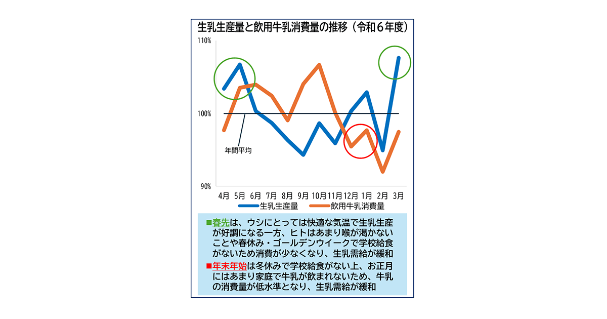 生乳は例年、春先と年末年始に需要より供給が多くなる需給の緩和が起こります。年末年始の生乳生産量は多くありませんが、冬休みで学校給食がない上、お正月にはあまり家庭で牛乳が飲まれず消費量が極めて低水準となるためです。