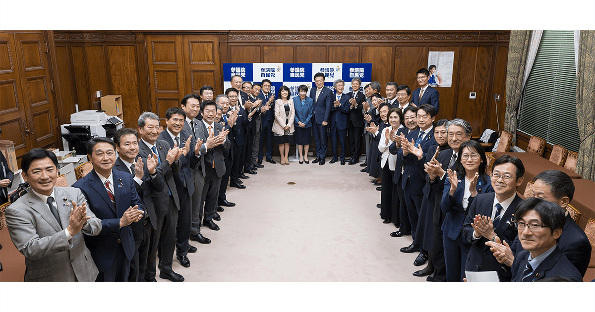 令和7年度補正予算が成立し参院自民党の控室で高市早苗総理を中心に予算成立を喜び合う参院自民党のメンバー