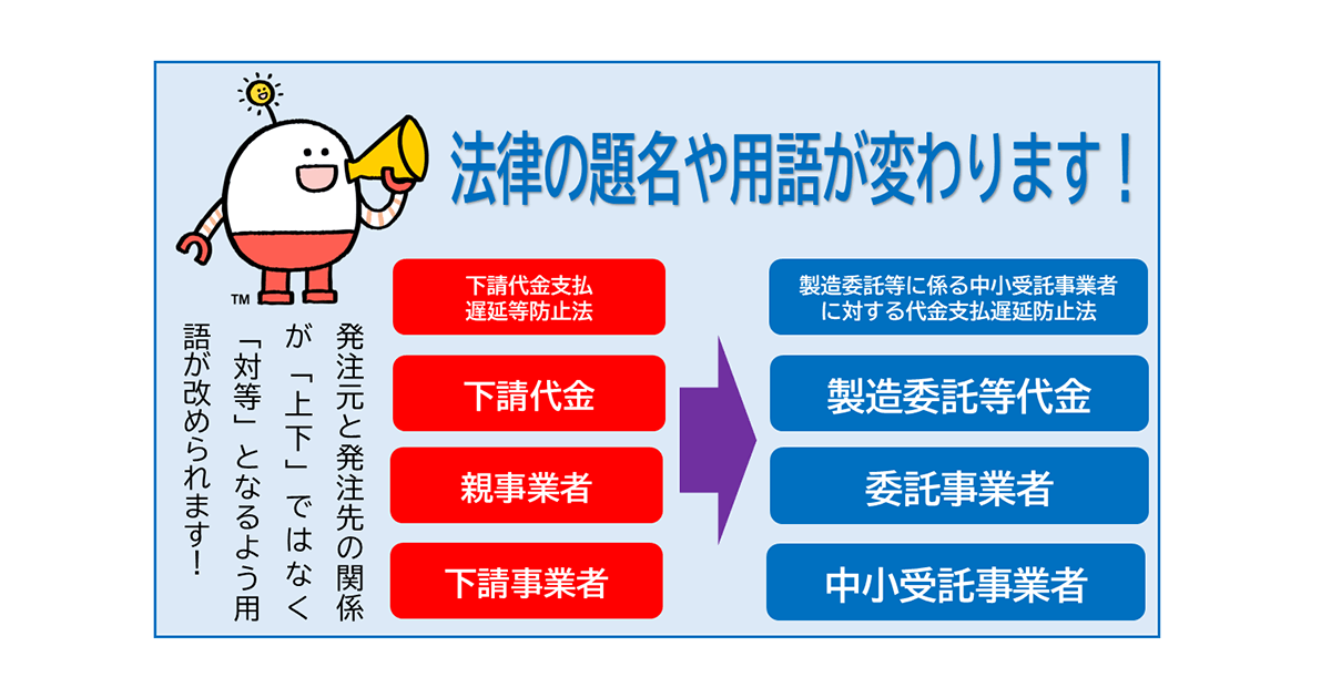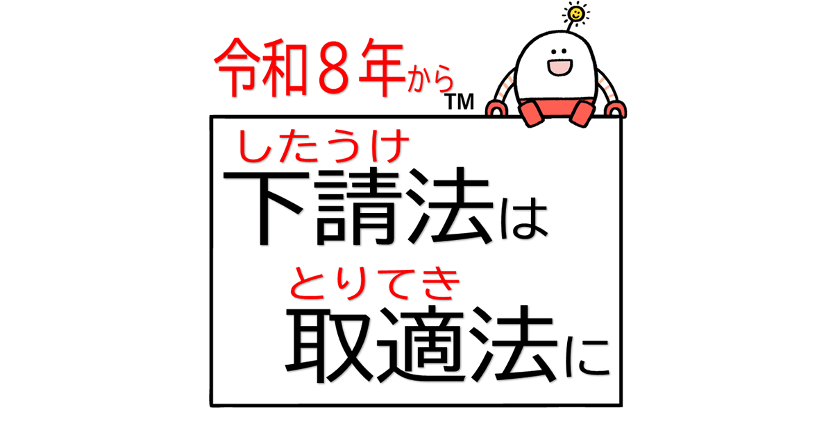 令和8年1月1日から「下請法」が改正され、「中小受託取引適正化法(通称:取適法)」が施行されます。受託側の中小企業・小規模事業者の利益保護を強化し、大企業と中小企業・小規模事業者が対等な取引環境をつくり上げます。