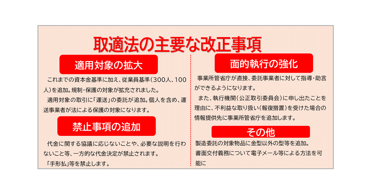 取適法は令和7年の通常国会で法改正が実現し、周知期間を経て令和8年1月1日に施行を迎えます。わが国の商慣習にあった「下請」という概念を一掃。対等なパートナーシップで取引を行い、これまで「下請いじめ」といった負のイメージを解消します。