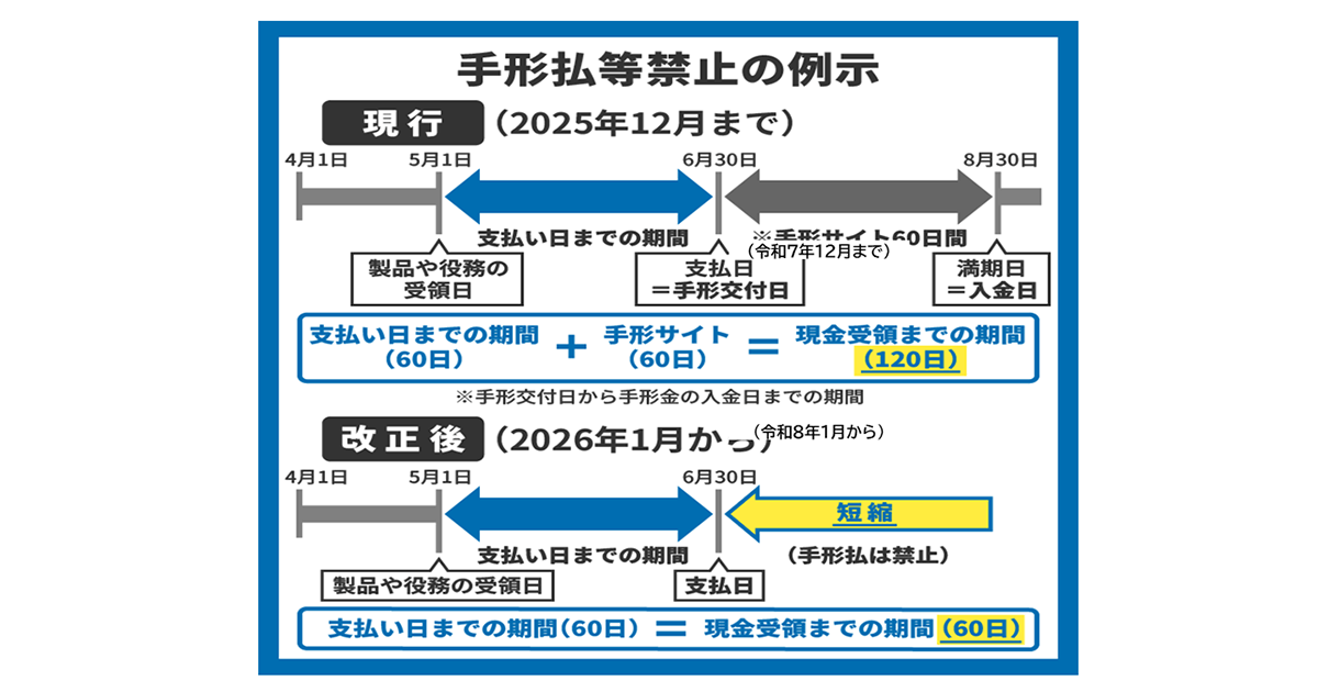 取適法ではわが国の長年の商慣習として存在していた手形支払い(約束手形)を禁止します。手形による代金受け取りは受注から、現金を受け取るまでの期間が長くなり、受注者にとって資金繰りの面で大きな負担となってきました。