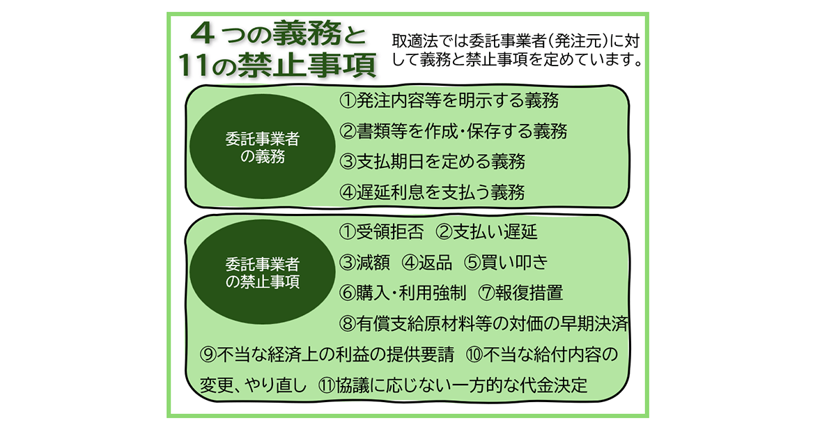 発注後の返品や、買い叩き、指定する物品等を強制して購入、利用させること、報復措置といった11の事項を禁止。発注内容を明示し、書類等を作成することや、支払期日を定めることも義務化します。