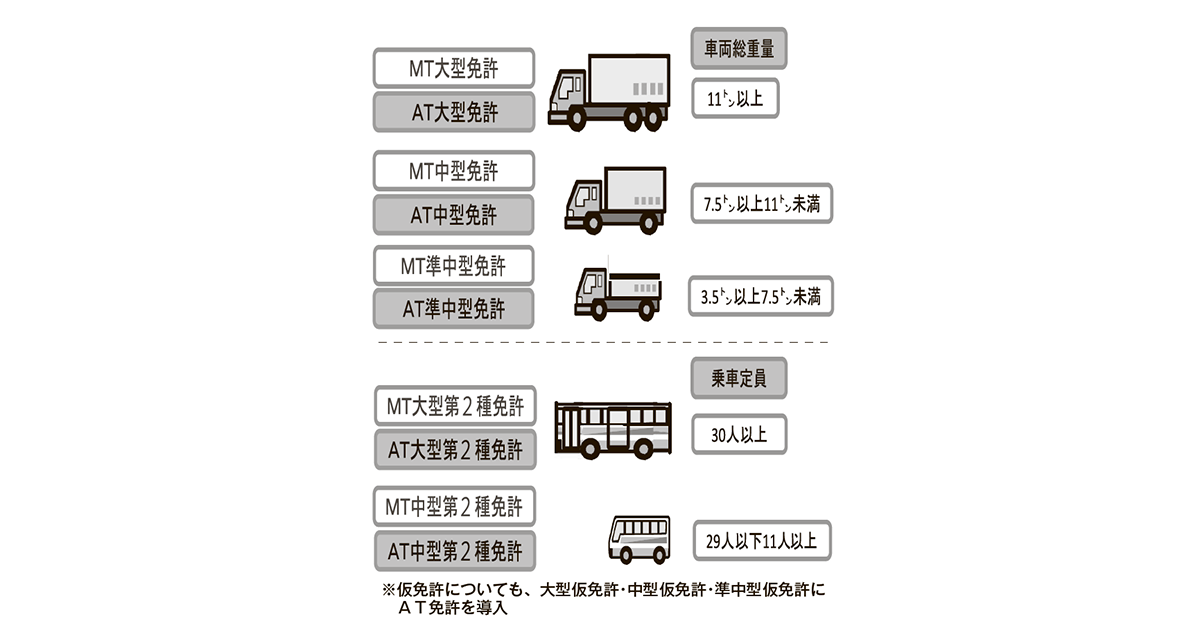 施行日は「AT準中型」、「AT中型」、「AT中型2種」が4月1日、「AT大型」は令和9年4月1日、「AT大型2種」は同10月1日の予定です。