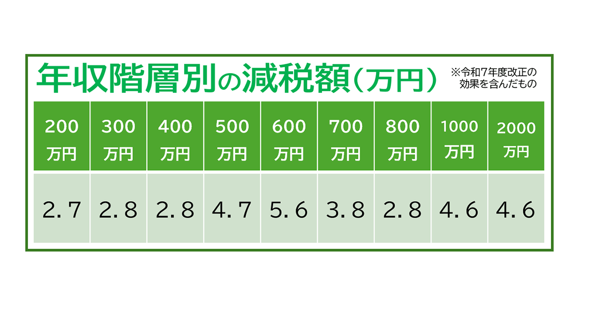 令和7年度税制改正では低所得者(年収200万円以下)の基礎控除・給与所得控除を160万円まで引き上げ、「働き控え」の解消は一定程度進められましたが、今回の見直しは物価高に苦しむ中間層の負担軽減を重視しました。基礎控除の特例区分を4区分から2区分に簡素化。新たな見直しによって規模にばらつきはありますが、令和7年度改正と合わせて1人当たり約3~6万円の所得税減税を実現。全ての納税者に減税の恩恵が及ぶ仕組みとなっています。