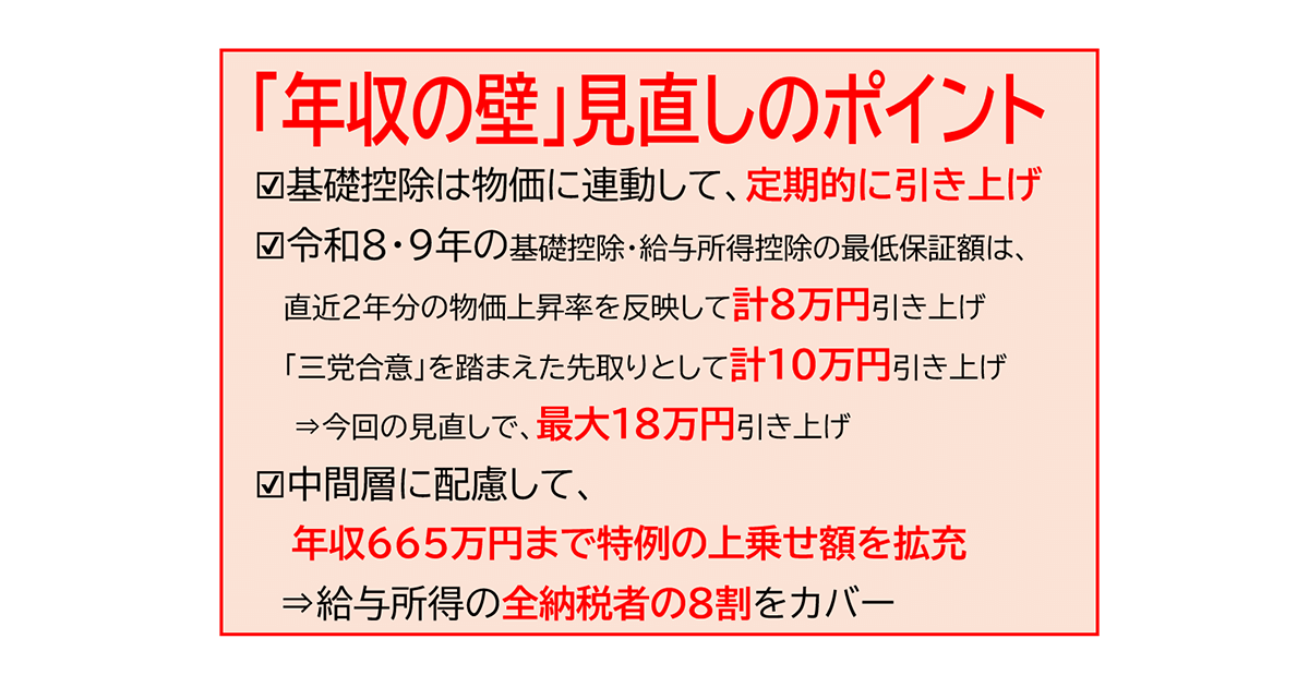 昨年末に高市政権の下で初めて取りまとめられた令和8年度与党税制改正大綱では、物価高を乗り越える「強い経済」を実現するため、基礎控除等の見直しをはじめ、物価高への対応といった重要な課題に、税制面からしっかりと取り組む内容となりました。わが党は、令和8年度予算と税制関連法案の早期成立に向けて、通常国会に臨みます。特に注目が集まった「年収の壁」の見直しについて詳しく紹介します。