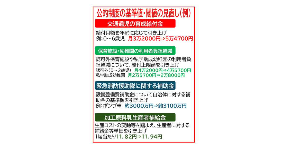 このうち公的制度の「閾値(しきいち)」と呼ばれる基準額は、交通遺児育成給付金次長について、給付月額を年齢に応じて引き上げ。認可外保育施設や私学助成幼稚園の負担軽減についても給付上限を引き上げます。これらは利用者に直接引き上げのメリットが届く措置になります。