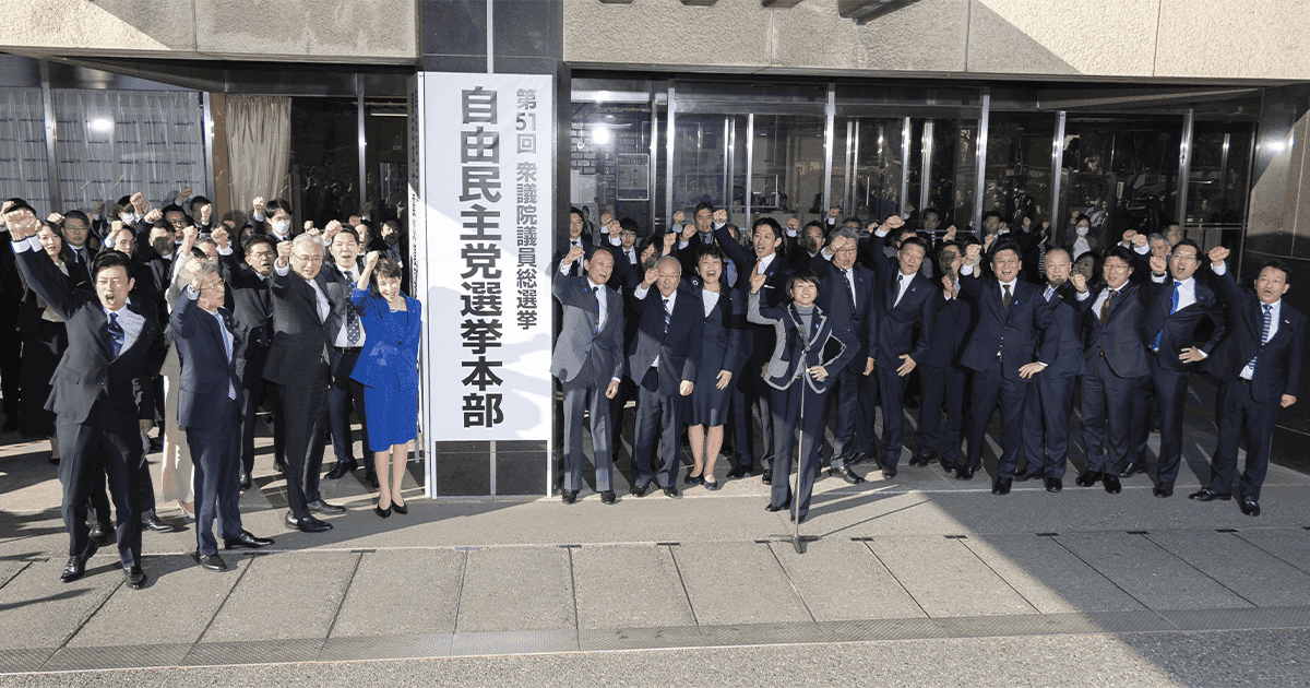 衆院解散後、党本部に選挙本部の看板が掛けられ高市早苗総裁を中心に総選挙の勝利を誓った