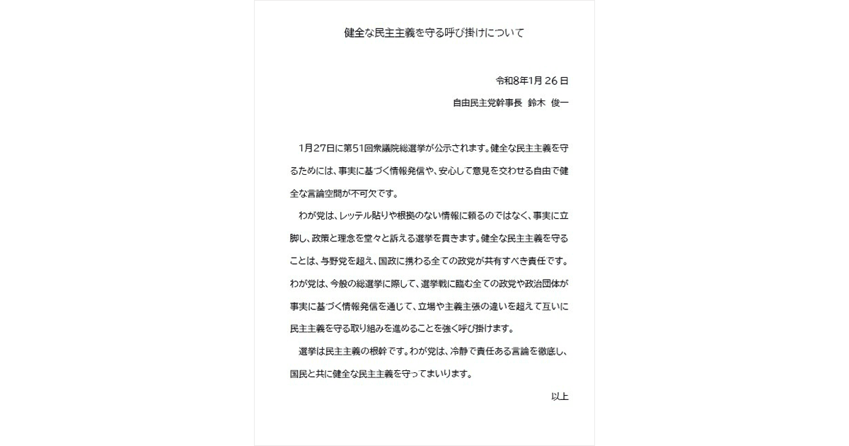 1がつ27日に衆院総選挙が公示されるのを前に、鈴木俊一幹事長は1月26日、「選挙戦に臨む全ての政党や政治団体が事実に基づく情報発信を通じて、立場や主義主張の違いを超えて互いに民主主義を守る取り組みを」とする呼び掛けを行いました。