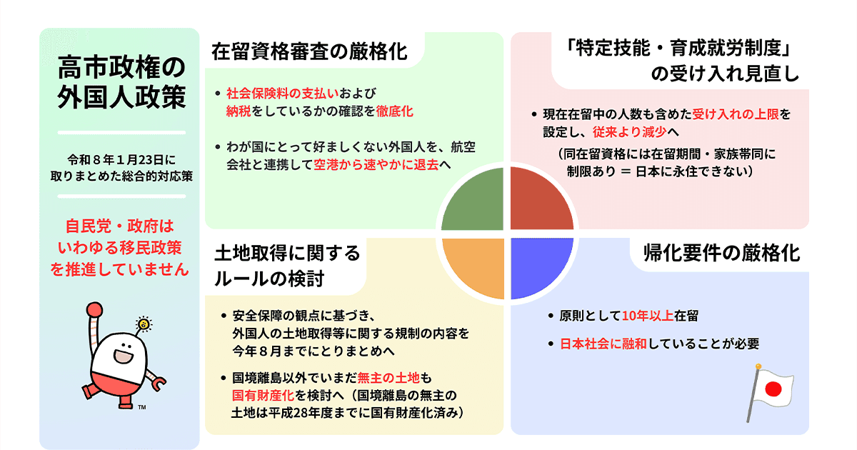高市政権が取りまとめた総合的な外国人政策では、主に出入国・在留管理等の適正化や外国人制度の適正化、外国人の土地取得に関するルールの在り方の検討等が盛り込まれ、日本に滞在する外国人への対応を包括的に反映しました。