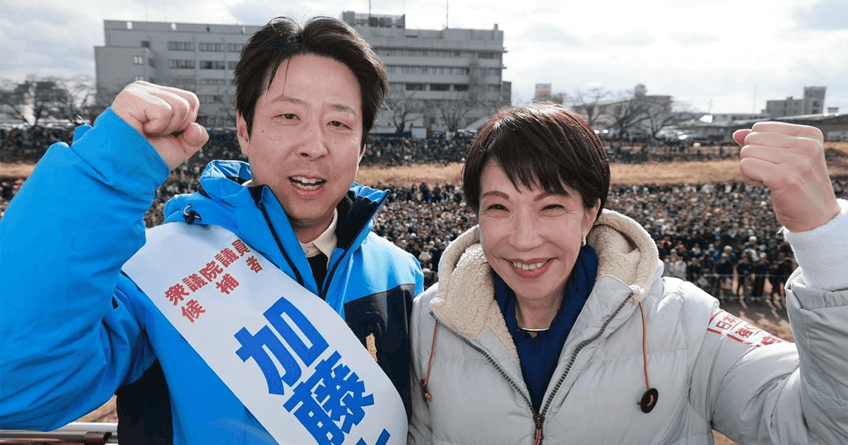 国の財政政策、今までの行き過ぎた形式思考から脱する未来への投資不足から脱する。この流れを高市内閣で断ち切る。そしてちゃんと必要な予算は当初から組む。そういった風に変えていって、皆様が将来に渡って安全で豊かに生活することができる。そして外交面でも日本がインド太平洋の輝く灯台として仰ぎ見られるような自由と民主主義の国だって、たくさんの人から尊敬されるような、そして日本人に生まれて良かったなって、孫や子の代までみんな思ってくれるような、そんな日本をつくるために、安全で豊かな日本を作る。そのための政策転換は今しかないで、自民党の公約で初めて打ち出した責任ある積極財政。大きな方針転換です。これを皆様にご審判いただきたい。いいよって言ってくださったら、力強く進めてまいります。ダメだったら潔く私は身を引きます。でも、どうか皆様の力で加藤さん、勝たせてください。加藤さんを勝たせてくれると大きな力になる。だって、立候補の動機が責任ある積極財政。これ一緒にやりたいって言って、思い切って立候補してくれはったんですもん。