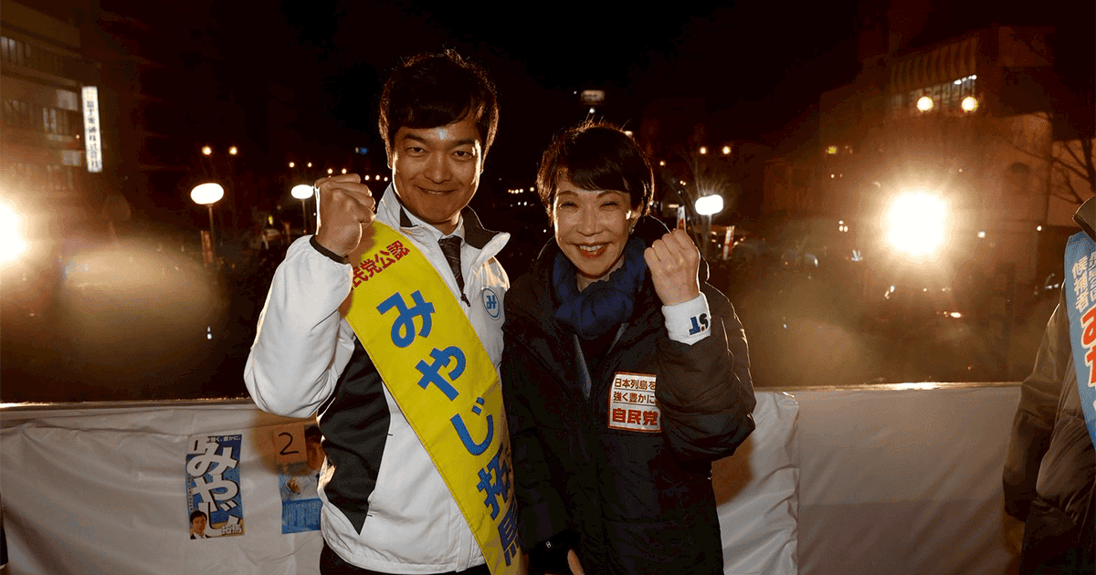 日本列島を、強く豊かに。高市早苗でございます。そして鹿児島を、強く豊かに。みやじ拓馬でございます。私たちは同じ方向を向いて仕事をしている。日本列島を、強く豊かに。なんで列島という言葉を私が入れたか。これは47都道府県どこに住んでいても安全に生活することができて、必要な医療や福祉を受けることができて、質の高い教育を受けることができて、ちゃんと働く場所がある。