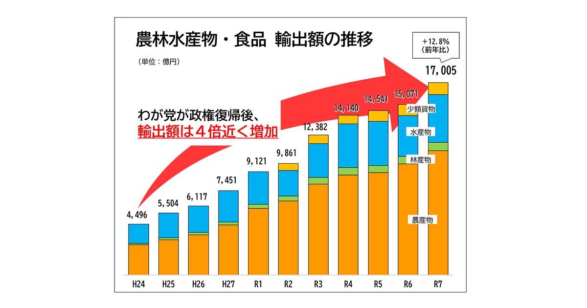 わが党が政権を奪還した平成24年当時、農林水産物・食品の輸出額は4497億円でした。政府与党では、農林水産業や食品産業の「海外から稼ぐ力」を強化するため、農林水産物・食品の輸出拡大に向けた実行戦略を策定。わが国の強みを最大限に生かす品目別の具体的目標の設定等を通じて官民一体で海外での販売力を高めてきました。