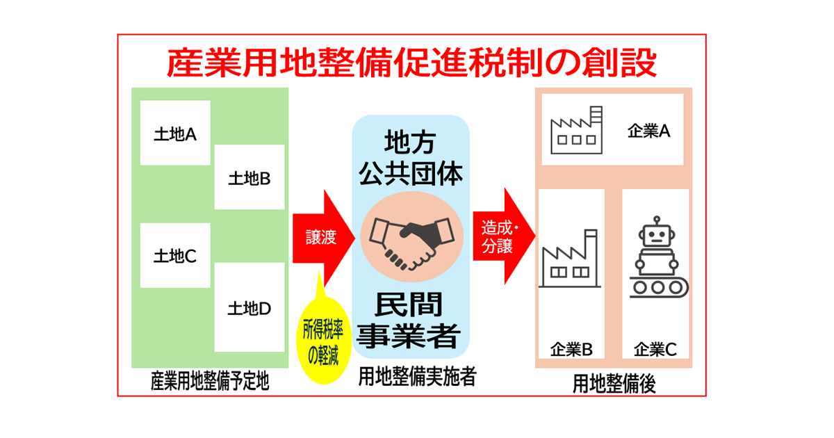 新たな制度では民間事業者と連携した産業用地整備にも土地の譲渡に税制上のメリットを設けることで、地域経済に波及する産業用地整備を後押し、地方に経済成長の活力をもたらします。