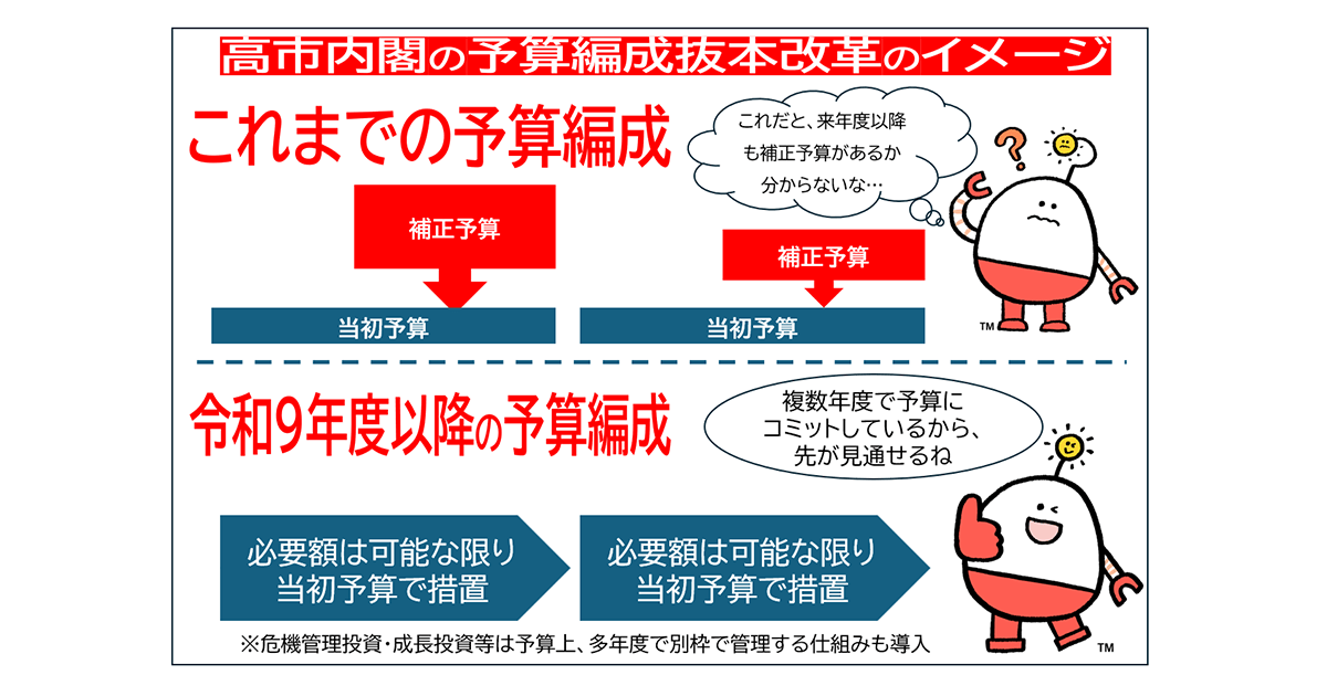 高市政権が目指す予算編成の姿は、これまで「当初予算で絞って、補正予算で積み増す」といった手法と決別し、必要な予算はできるだけ当初予算で措置するものです。