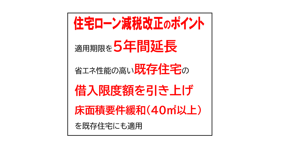 令和8年度改正では適用期限を令和12年末まで5年間延長。令和8年以降に入居する場合は、省エネ性能の高い既存住宅について、借入限度額を引き上げ、19歳未満の子を有する子育て世帯や、夫婦いずれかが40歳未満の若者夫婦世帯への借入限度額を上乗せします。控除期間も13年間に拡充します。床面積要件も、昨年度の改正で新築住宅に限って40平方メートル以上に緩和した措置を既存住宅にも適用。コンパクトな中古物件の購入でも減税措置が受けられるようになります。