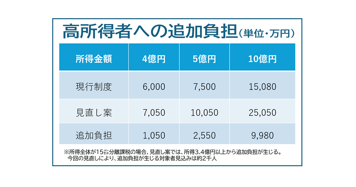高所得者に対する税負担は(1)通常の所得税額(2)合計所得金額から特別控除額(3.3億円)を差し引いた額に22.5%を掛けた金額――の(2)が(1)を上回る場合に申告納税を求めてきました。合計所得金額には株式の譲渡所得や、土地建物の譲渡所得、給与・事業所得等、各種所得を合算した金額となっています。