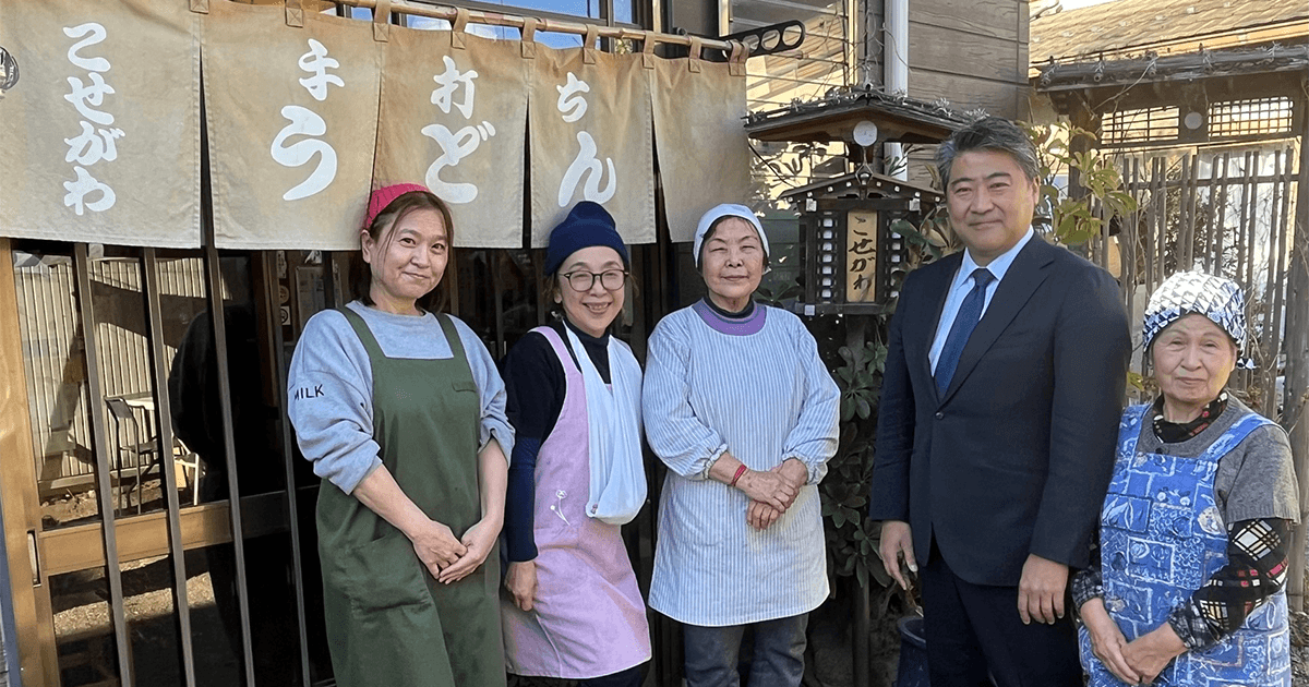 「手打ちうどん こせがわ」さんの店主である岩崎さんと従業員の方と共に