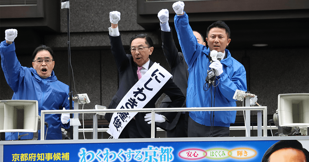 国際情勢の緊迫化による暮らしへの影響や構造的な人口減少といった課題を挙げ、3期目では京都府民の暮らしや中小企業の事業活動を守り抜く決意を強調。安心、はぐくみ、輝きをキーワードとした「誰もがわくわくする京都」の実現へ支持を呼び掛けました。