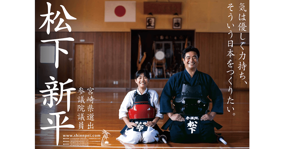 このポスターは、16年前の参院選を前に政治活動用ポスターとして使用しました。私には三姉妹がおり、剣道を習っていた末っ子(当時小学4年生、現在25歳)と撮ったものです。娘は、一緒の撮影を嫌がっていましたが、妻から、「お父さんは選挙が厳しい」と聞くと、お小遣いと引き換えに「分かった」と撮影に応じました。笑
