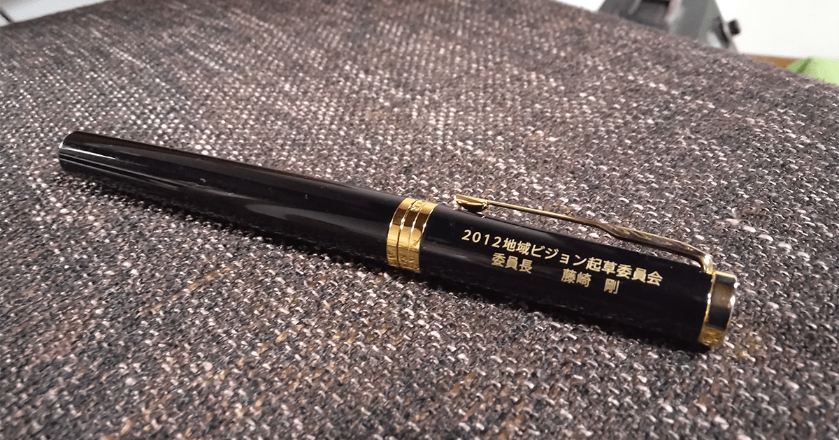 私が県議会議員として初当選した平成15年に鹿児島青年会議所(JC)に入会しました。しかしその後落選してしまい、退会するかどうかの瀬戸際まで追い込まれましたが、仲間の支えで何とか続けることができました。落選から復帰後、「JCには恩義がある。次年度委員長を引き受けます」と申し出て受けたのが、地域ビジョン起草委員会でした。同じ委員会には保岡宏武現衆院議員もいて、1年かけて鹿児島の未来ビジョンを答申しました。平成24年12月末、委員長の役目を終える際に委員会メンバーからいただいたのがこの万年筆です。