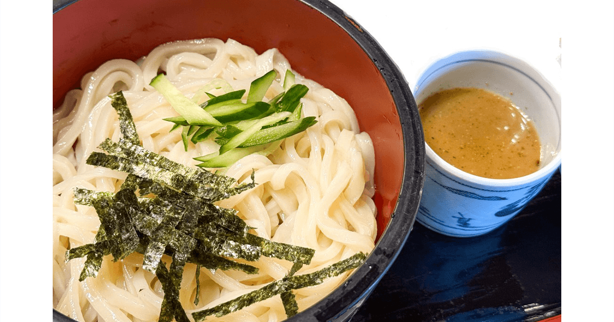 きゅうり、大葉、みょうがの入ったごまだれのつけ汁につけて食べる冷や汁うどん