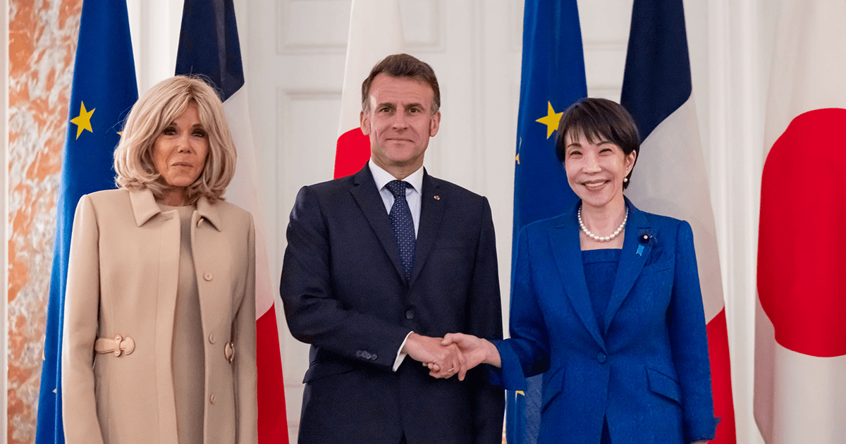 フランスのマクロン大統領夫妻を迎賓館で出迎える高市早苗総理(右端)