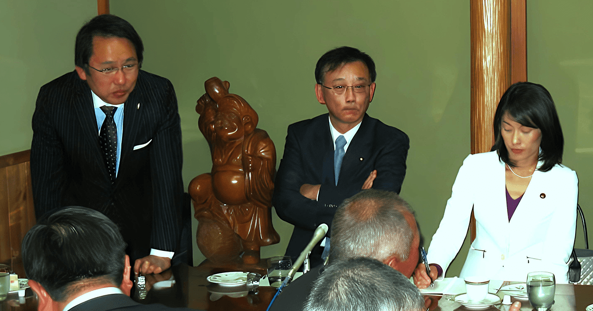 平成21年に下野したわが党が再起を図るために開催した「第1回車座対話」に、谷垣禎一総裁(当時、中央)らと共に出席する葉梨康弘衆院議員(左)
