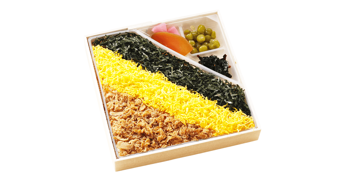 鶏のスープでほんのり甘辛く炊いたご飯に鶏肉・錦糸卵をのせ、さらに薫り高い刻み海苔がアクセントとして添えられています。