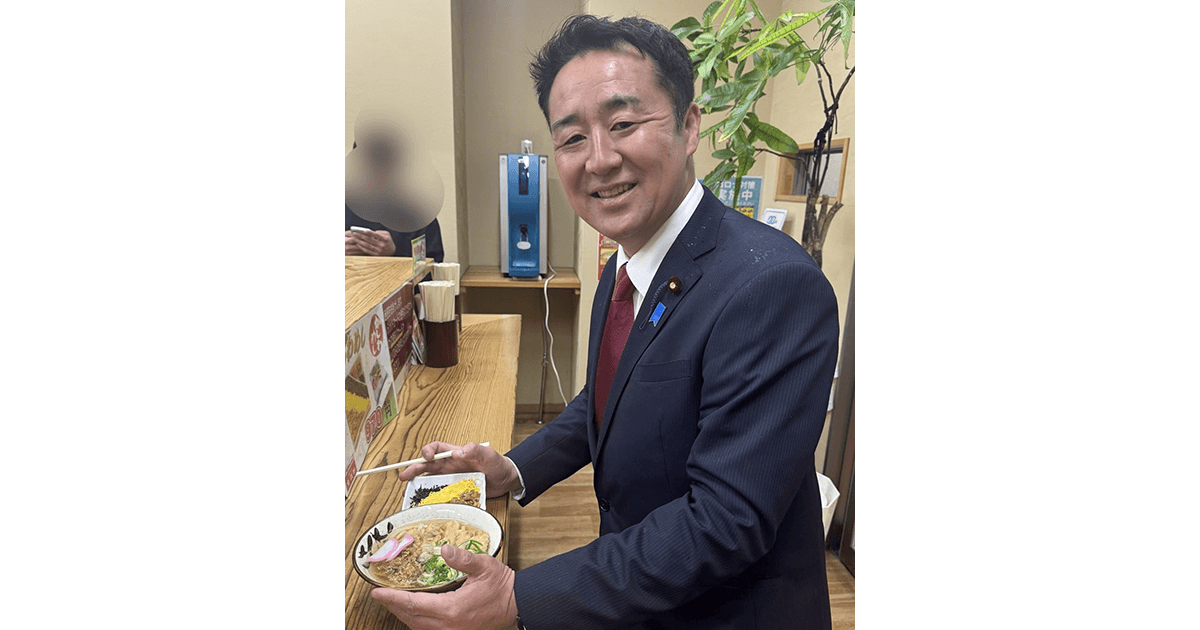 やさしいおだしにつかったやわらかい「かしわうどん」を食べる三原朝利衆議院議員