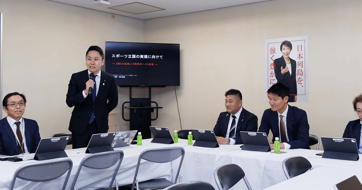 会議の冒頭あいさつで朝日委員長は、「スポーツ政策を応援する議員を増やしていきたい」と述べた上で、今後は高い目標と、高い視座を持ってスポーツ周辺の事業政策に取り組んでいきたいと呼び掛けました。