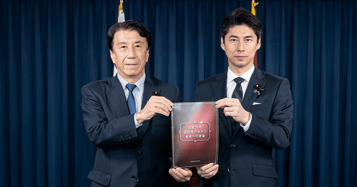 完成した立党70年新ビジョンを手にする齋藤健新ビジョン策定本部座長(左)と中曽根康隆起草委員長(右)