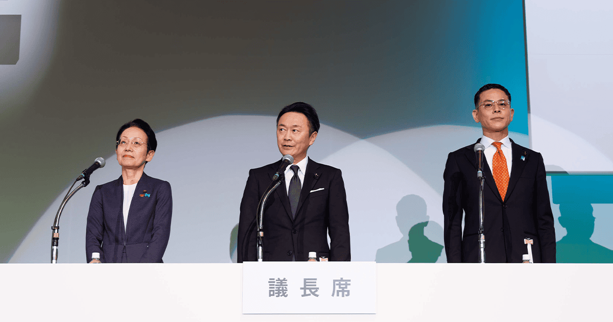 議長団に選出された左から江島佐知子党佐賀県支部連合会女性局長、吉田祐樹党北海道連幹事長、田中泰彦党愛知県連青年総局長
